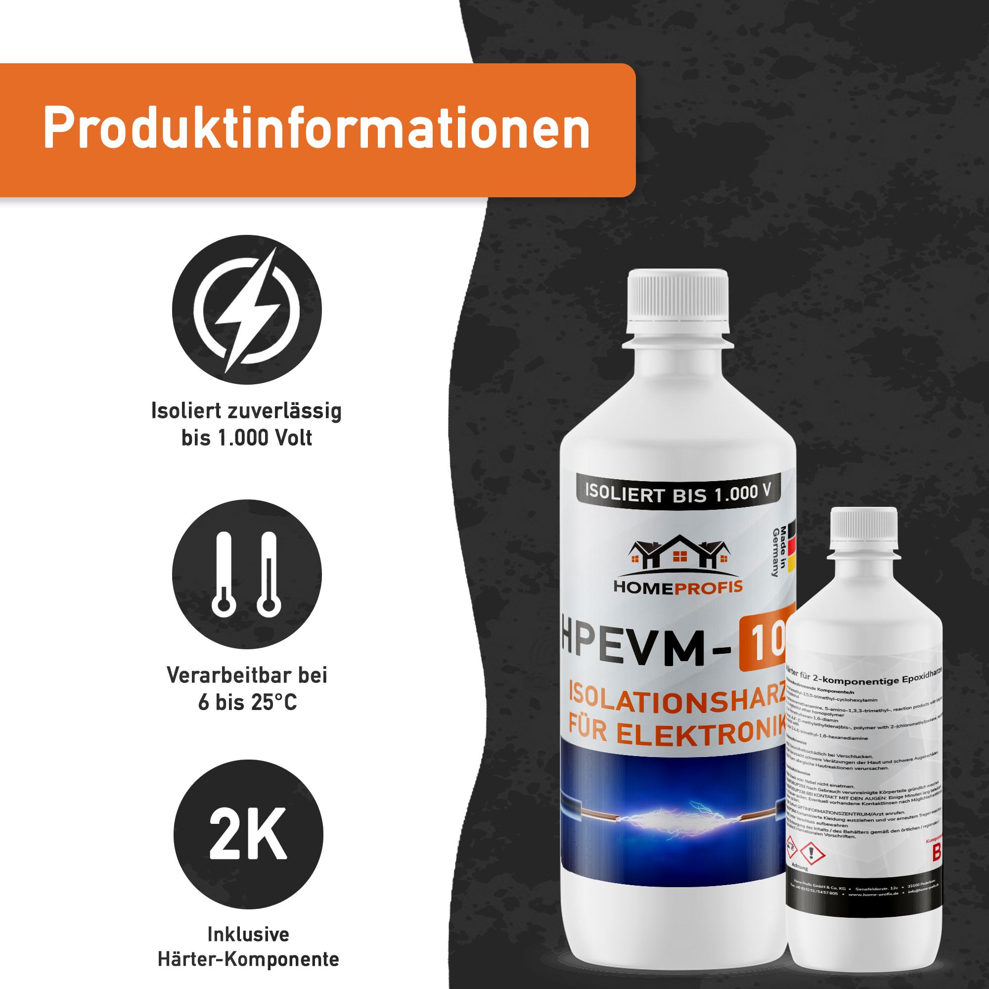 Die Home Profis HPEVM-100 ist eine 2-komponentige Elektrovergussmasse auf Epoxidharzbasis, welche hervorragend dafür geeignet ist, um Abzweigdosen, LED-Stripes und Kabelmuffen zu vergießen. Außerdem wird sie häufig zum Isolieren und Vergießen von Platinen in Gehäusen und zum Schutz von beschädigten Kabelstellen verwendet.